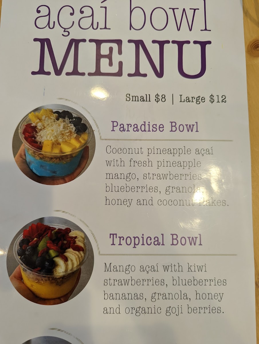 Organic açaí, granola, strawberries, blueberries, banana, chia seeds, peanut butter or almond butter, shaved coconut, honey