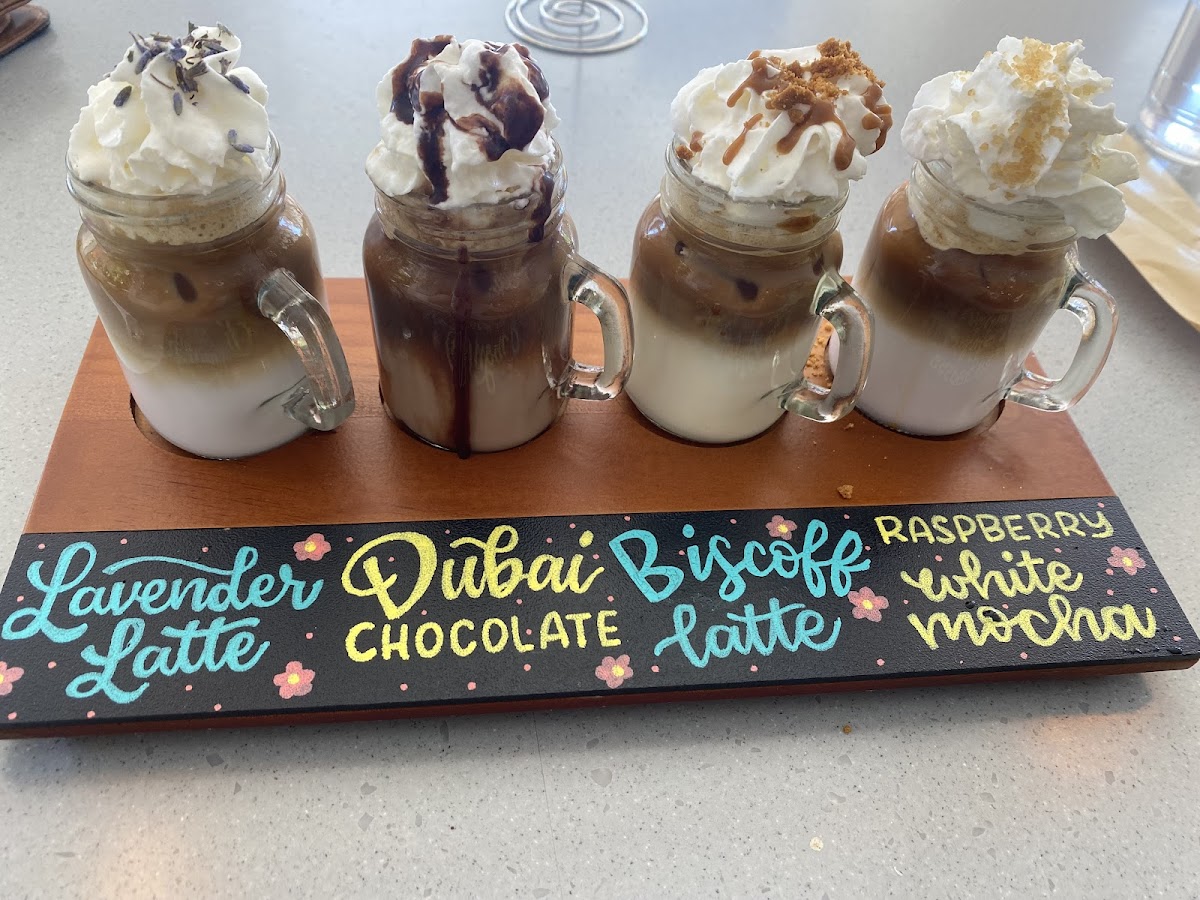 Espresso, milk, chocolate, pistachio, coconut